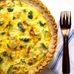 Slide the pie dish carefully into the oven and bake for 30-40 minutes until the top is browned and the egg custard is puffed and golden. Let cool on a wire rack for about 10-15 minutes and then slice and serve with a fresh salad.
